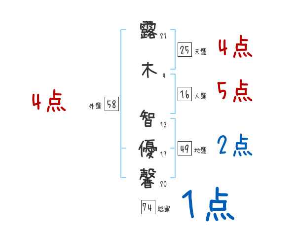 外運![]() | 露木智優馨さんの外運は58画の4つ星!安定した生活。大器晩成タイプ。 生活面を象徴する運勢です。外部から受ける影響力を表し、結婚運、家庭運や職場、環境への順応性を表します。 |