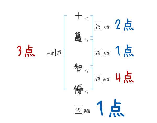 天運![]() | 十亀智優さんの天運は26画の2つ星!波瀾万丈かも。信頼できる人を大事にしましょう。 家系が持つ宿命的な運勢を表します。祖先から受け継いだ苗字ですので自分の力が及びません。家柄を象徴します。 |