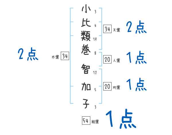 天運![]() | 小比類巻智加子さんの天運は34画の2つ星!独創性に優れるが、自尊心が強く災難に注意しましょう。 家系が持つ宿命的な運勢を表します。祖先から受け継いだ苗字ですので自分の力が及びません。家柄を象徴します。 |