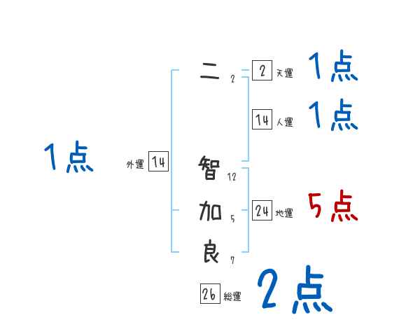外運![]() | 二智加良さんの外運は14画の1つ星!人に対して優しいがストレスを溜め込みがち。人間関係のトラブルを避けるよう気をつけましょう。 生活面を象徴する運勢です。外部から受ける影響力を表し、結婚運、家庭運や職場、環境への順応性を表します。 |