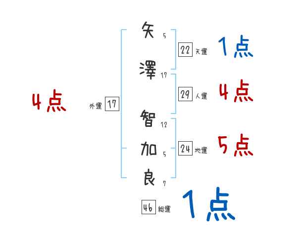 外運![]() | 矢澤智加良さんの外運は17画の4つ星!積極的な行動力。地位を気づき財産を手に入れる。純粋な心と直感力。 生活面を象徴する運勢です。外部から受ける影響力を表し、結婚運、家庭運や職場、環境への順応性を表します。 |