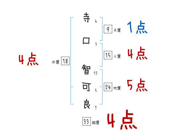 天運![]() | 寺口智可良さんの天運は9画の1つ星!消極的で才能を発揮することが苦手なことも。周りの意見に耳を傾けましょう。 家系が持つ宿命的な運勢を表します。祖先から受け継いだ苗字ですので自分の力が及びません。家柄を象徴します。 |
