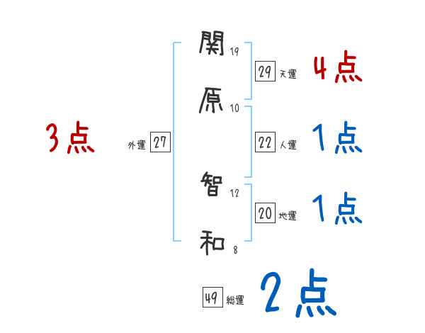 天運![]() | 関原智和さんの天運は29画の4つ星!完全主義で才能がある。厳格な心の持ち主。 家系が持つ宿命的な運勢を表します。祖先から受け継いだ苗字ですので自分の力が及びません。家柄を象徴します。 |