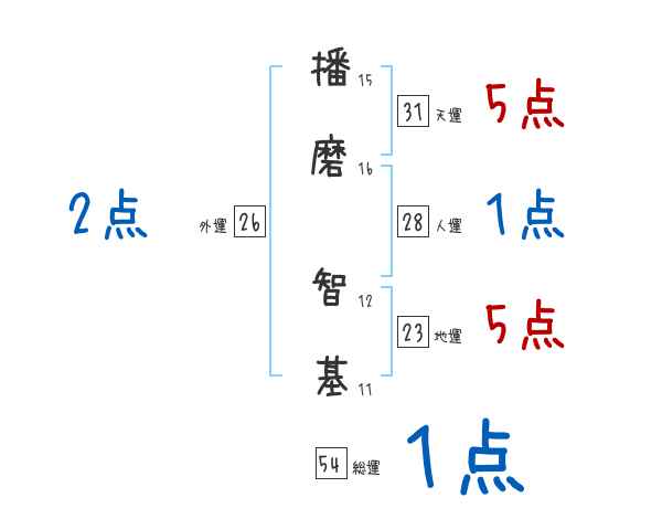 天運![]() | 播磨智基さんの天運は31画の5つ星!社交性があり判断力に優れる。順風満帆な人生で円満な生活。 家系が持つ宿命的な運勢を表します。祖先から受け継いだ苗字ですので自分の力が及びません。家柄を象徴します。 |