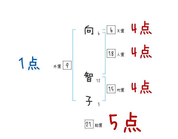 天運![]() | 向智子さんの天運は6画の4つ星!慎重な努力家で信頼を得る。誠実な精神で向上心に優れる。 家系が持つ宿命的な運勢を表します。祖先から受け継いだ苗字ですので自分の力が及びません。家柄を象徴します。 |