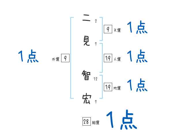 総運![]() | 二見智宏さんの総運は28画の1つ星!家庭環境に注意。スポーツで活躍できる能力があるかも。 あなたの人生を表す1番重要な運勢です。生涯を通じて影響する総合運となり、主に50歳以降の晩年期に影響を及ぼします。 |