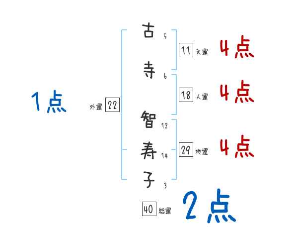 天運![]() | 古寺智寿子さんの天運は11画の4つ星!着実に富や地位を得る幸運な人生。 家系が持つ宿命的な運勢を表します。祖先から受け継いだ苗字ですので自分の力が及びません。家柄を象徴します。 |