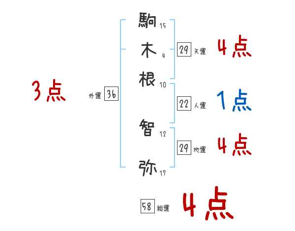 外運![]() | 駒木根智弥さんの外運は36画の3つ星!先見性が豊かです。多少神経質で苦労することも。 生活面を象徴する運勢です。外部から受ける影響力を表し、結婚運、家庭運や職場、環境への順応性を表します。 |