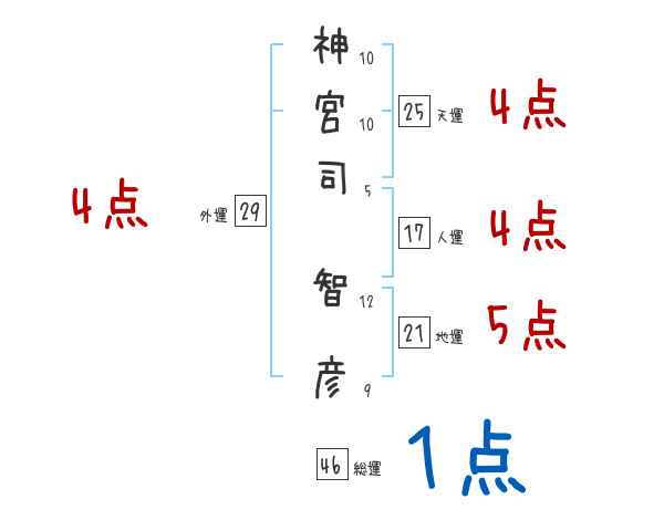 天運![]() | 神宮司智彦さんの天運は25画の4つ星!個性があり才能があふれる。強運の持ち主で発展する。 家系が持つ宿命的な運勢を表します。祖先から受け継いだ苗字ですので自分の力が及びません。家柄を象徴します。 |