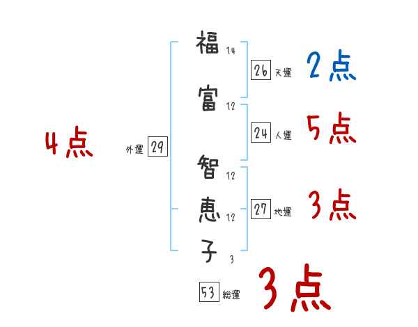 外運![]() | 福富智恵子さんの外運は29画の4つ星!完全主義で才能がある。厳格な心の持ち主。 生活面を象徴する運勢です。外部から受ける影響力を表し、結婚運、家庭運や職場、環境への順応性を表します。 |