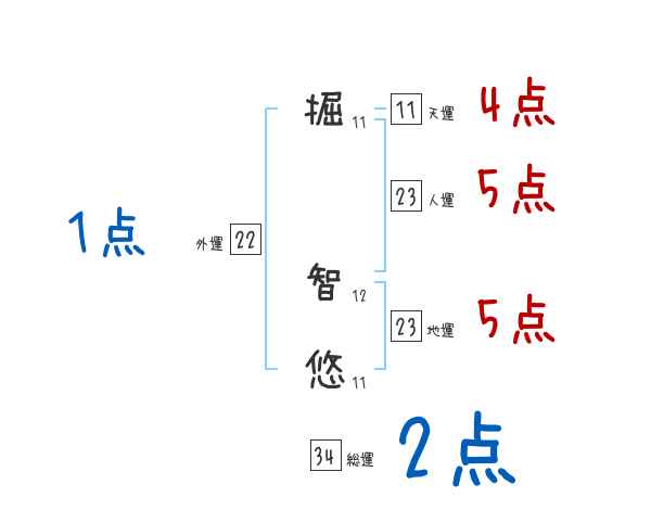 総運![]() | 掘智悠さんの総運は34画の2つ星!独創性に優れるが、自尊心が強く災難に注意しましょう。 あなたの人生を表す1番重要な運勢です。生涯を通じて影響する総合運となり、主に50歳以降の晩年期に影響を及ぼします。 |