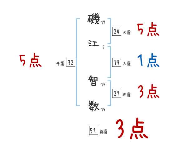 外運![]() | 磯江智数さんの外運は32画の5つ星!柔軟性があり成功する。チャンスが多く金運が良い。 生活面を象徴する運勢です。外部から受ける影響力を表し、結婚運、家庭運や職場、環境への順応性を表します。 |