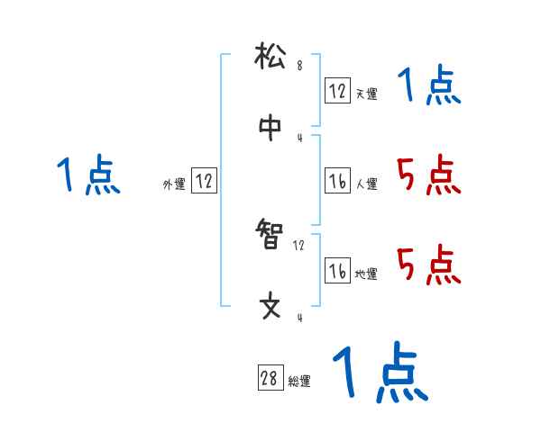 総運![]() | 松中智文さんの総運は28画の1つ星!家庭環境に注意。スポーツで活躍できる能力があるかも。 あなたの人生を表す1番重要な運勢です。生涯を通じて影響する総合運となり、主に50歳以降の晩年期に影響を及ぼします。 |