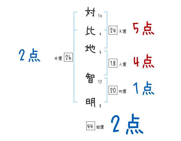 総運![]() | 対比地智明さんの総運は44画の2つ星!誠実で慎重な性格。物事を考えすぎないように注意しましょう。 あなたの人生を表す1番重要な運勢です。生涯を通じて影響する総合運となり、主に50歳以降の晩年期に影響を及ぼします。 |