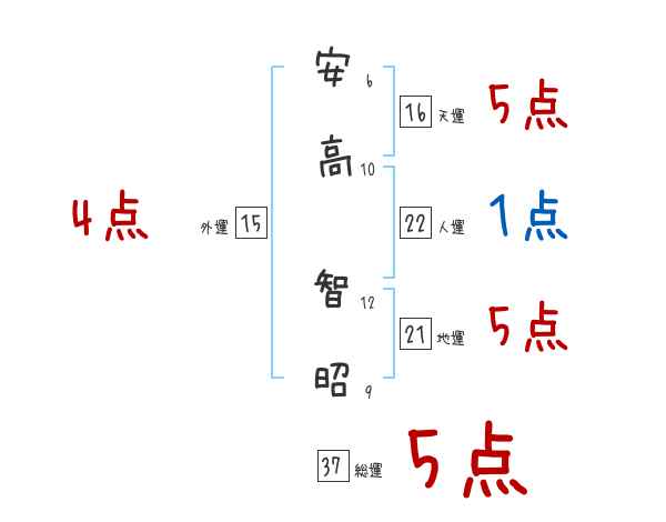 天運![]() | 安高智昭さんの天運は16画の5つ星!人望が厚く大きく発展する。逆転成功が見える。 家系が持つ宿命的な運勢を表します。祖先から受け継いだ苗字ですので自分の力が及びません。家柄を象徴します。 |