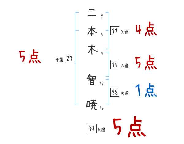 総運![]() | 二本木智暁さんの総運は39画の5つ星!社交性に優れ人望が厚い。人の上に立ち成功する。 あなたの人生を表す1番重要な運勢です。生涯を通じて影響する総合運となり、主に50歳以降の晩年期に影響を及ぼします。 |