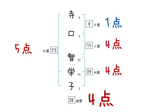天運![]() | 寺口智栄子さんの天運は9画の1つ星!消極的で才能を発揮することが苦手なことも。周りの意見に耳を傾けましょう。 家系が持つ宿命的な運勢を表します。祖先から受け継いだ苗字ですので自分の力が及びません。家柄を象徴します。 |