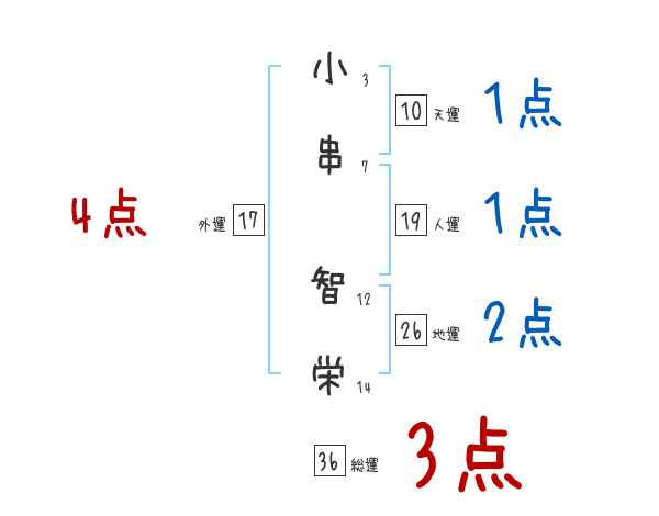 外運![]() | 小串智栄さんの外運は17画の4つ星!積極的な行動力。地位を気づき財産を手に入れる。純粋な心と直感力。 生活面を象徴する運勢です。外部から受ける影響力を表し、結婚運、家庭運や職場、環境への順応性を表します。 |