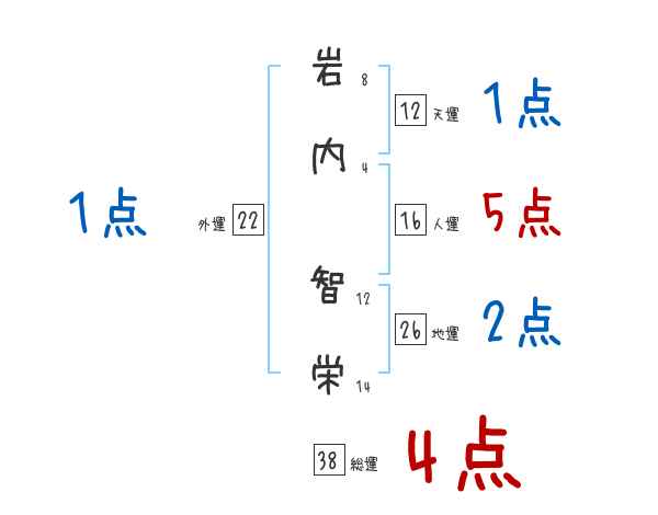 外運![]() | 岩内智栄さんの外運は22画の1つ星!努力することが苦手ないっぽう手先が器用。芸術性にも優れる。 生活面を象徴する運勢です。外部から受ける影響力を表し、結婚運、家庭運や職場、環境への順応性を表します。 |