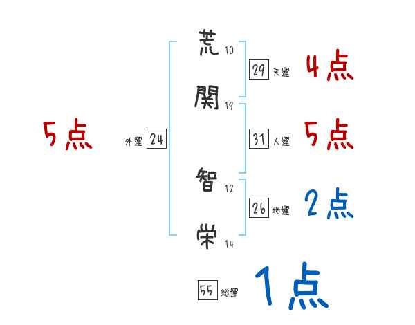 天運![]() | 荒関智栄さんの天運は29画の4つ星!完全主義で才能がある。厳格な心の持ち主。 家系が持つ宿命的な運勢を表します。祖先から受け継いだ苗字ですので自分の力が及びません。家柄を象徴します。 |