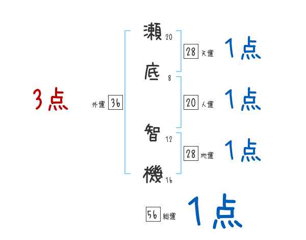 天運![]() | 瀬底智機さんの天運は28画の1つ星!家庭環境に注意。スポーツで活躍できる能力があるかも。 家系が持つ宿命的な運勢を表します。祖先から受け継いだ苗字ですので自分の力が及びません。家柄を象徴します。 |