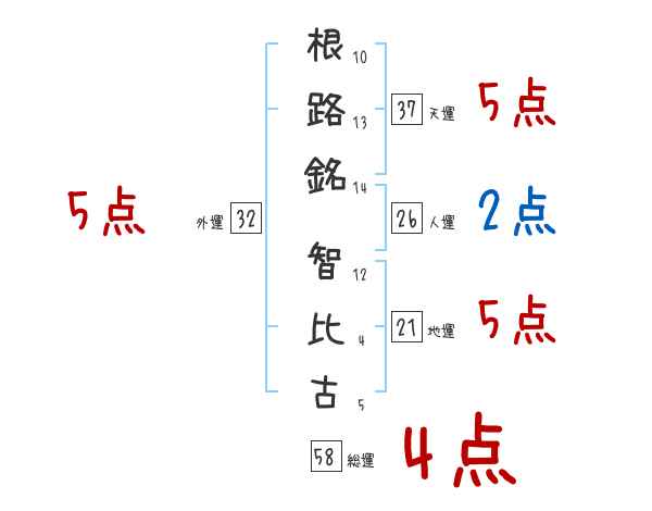 総運![]() | 根路銘智比古さんの総運は58画の4つ星!安定した生活。大器晩成タイプ。 あなたの人生を表す1番重要な運勢です。生涯を通じて影響する総合運となり、主に50歳以降の晩年期に影響を及ぼします。 |
