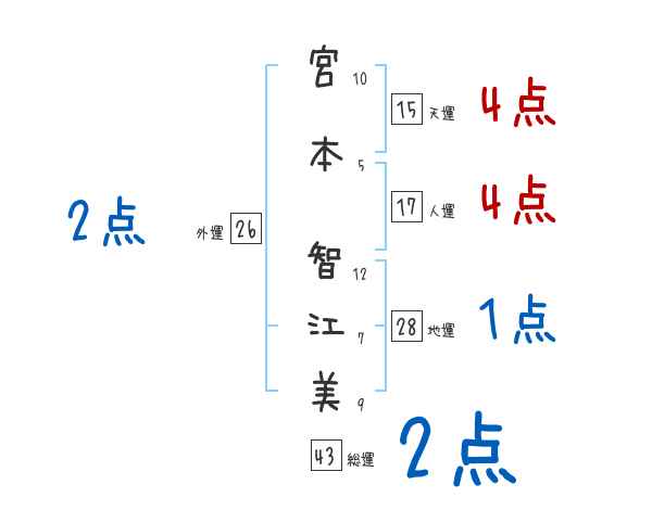 外運![]() | 宮本智江美さんの外運は26画の2つ星!波瀾万丈かも。信頼できる人を大事にしましょう。 生活面を象徴する運勢です。外部から受ける影響力を表し、結婚運、家庭運や職場、環境への順応性を表します。 |