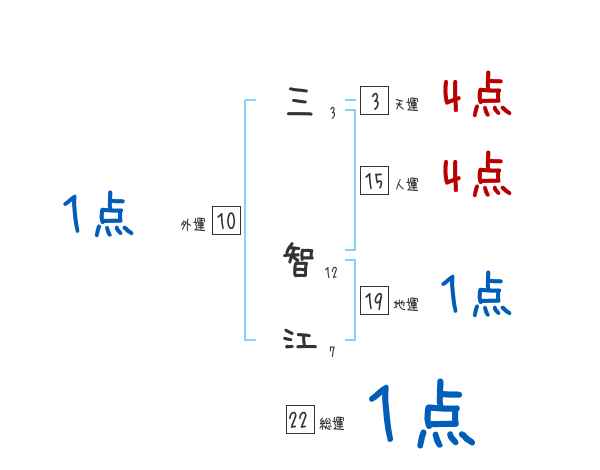 天運![]() | 三智江さんの天運は3画の4つ星!活動的で才能に恵まれ、多くの信頼を得る。希望に満ち成長する。 家系が持つ宿命的な運勢を表します。祖先から受け継いだ苗字ですので自分の力が及びません。家柄を象徴します。 |