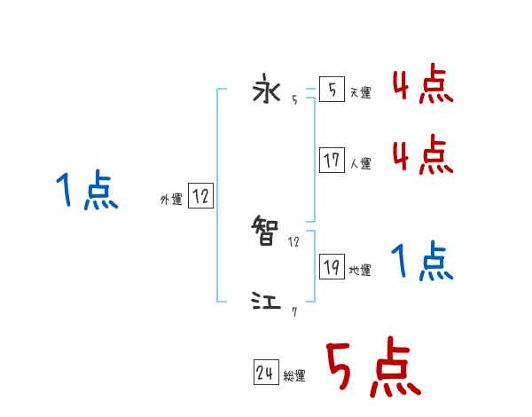 天運![]() | 永智江さんの天運は5画の4つ星!健康で安泰。協調性に優れ、財産に恵まれる。 家系が持つ宿命的な運勢を表します。祖先から受け継いだ苗字ですので自分の力が及びません。家柄を象徴します。 |