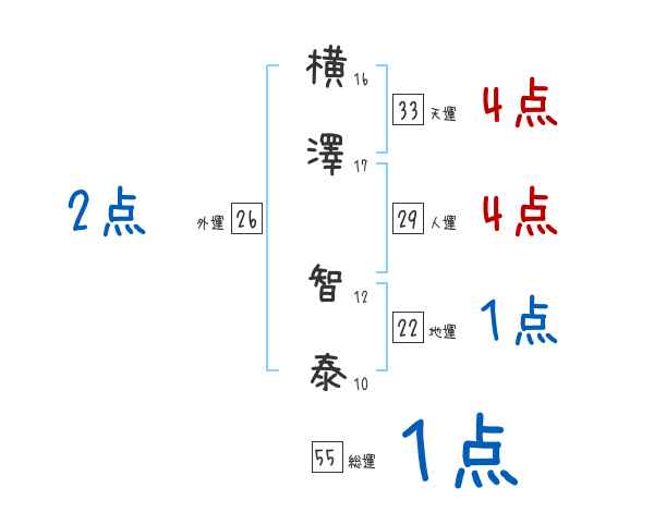 天運![]() | 横澤智泰さんの天運は33画の4つ星!権力志向でプライドが高い。勇気があり運を切り開き成功する。 家系が持つ宿命的な運勢を表します。祖先から受け継いだ苗字ですので自分の力が及びません。家柄を象徴します。 |