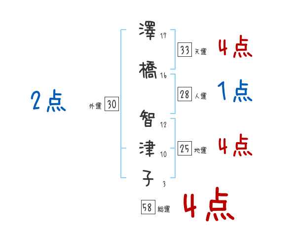 総運![]() | 澤橋智津子さんの総運は58画の4つ星!安定した生活。大器晩成タイプ。 あなたの人生を表す1番重要な運勢です。生涯を通じて影響する総合運となり、主に50歳以降の晩年期に影響を及ぼします。 |