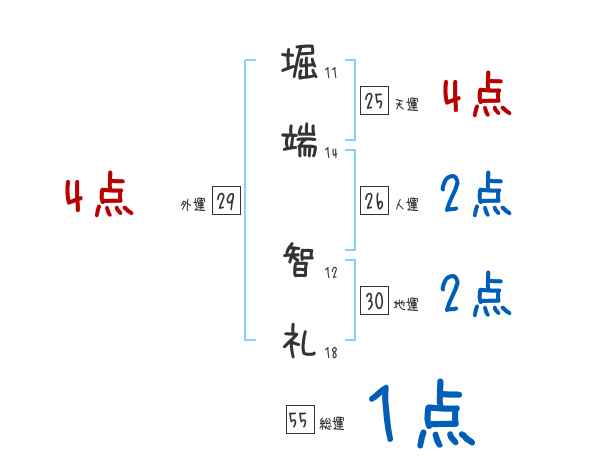 外運![]() | 堀端智礼さんの外運は29画の4つ星!完全主義で才能がある。厳格な心の持ち主。 生活面を象徴する運勢です。外部から受ける影響力を表し、結婚運、家庭運や職場、環境への順応性を表します。 |