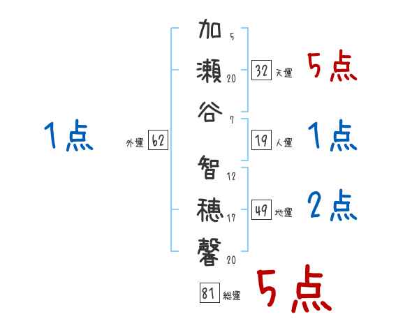 天運![]() | 加瀬谷智穂馨さんの天運は32画の5つ星!柔軟性があり成功する。チャンスが多く金運が良い。 家系が持つ宿命的な運勢を表します。祖先から受け継いだ苗字ですので自分の力が及びません。家柄を象徴します。 |