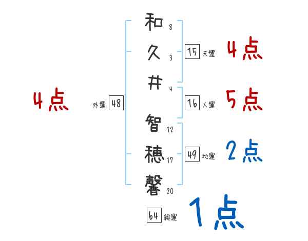 総運![]() | 和久井智穂馨さんの総運は64画の1つ星!災難が多く精神的なもろさに注意。トラブルに巻き込まれないように気をつけて。 あなたの人生を表す1番重要な運勢です。生涯を通じて影響する総合運となり、主に50歳以降の晩年期に影響を及ぼします。 |