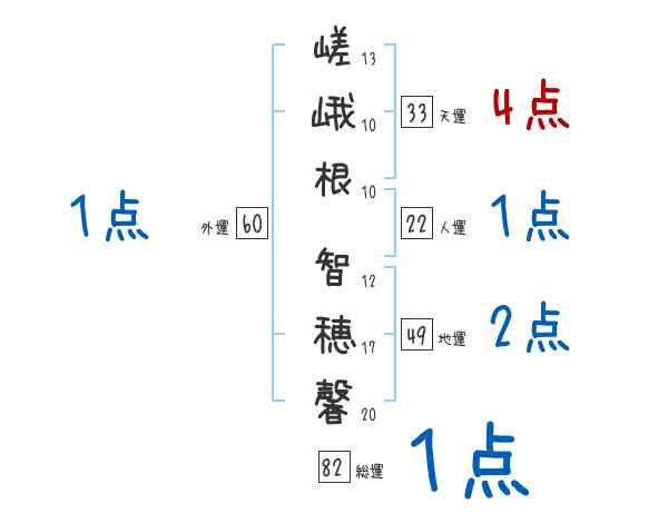 天運![]() | 嵯峨根智穂馨さんの天運は33画の4つ星!権力志向でプライドが高い。勇気があり運を切り開き成功する。 家系が持つ宿命的な運勢を表します。祖先から受け継いだ苗字ですので自分の力が及びません。家柄を象徴します。 |