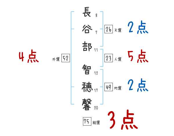 地運![]() | 長谷部智穂馨さんの地運は49画の2つ星!不安定な性格で明暗がある人生。周りの人には支援されやすい。 個性を表す基礎的な運勢です。性格形成や対人関係、行動力など家庭環境に影響されます。主に誕生してから20歳くらいまでの若年期の運勢を表します。 |