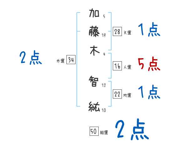 人運![]() | 加藤木智紘さんの人運は16画の5つ星!人望が厚く大きく発展する。逆転成功が見える。 性格や才能などを表す2番目に重要な運勢です。人間関係や協調性、社会的な成功に影響します。主に20歳から50歳ぐらいまでの中年期の運勢を表します。 |