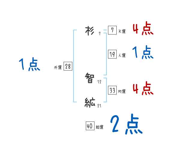 天運![]() | 杉智絋さんの天運は7画の4つ星!強い意志や信念を持ち独立心が強い。自立する。 家系が持つ宿命的な運勢を表します。祖先から受け継いだ苗字ですので自分の力が及びません。家柄を象徴します。 |