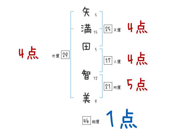 外運![]() | 矢満田智美さんの外運は29画の4つ星!完全主義で才能がある。厳格な心の持ち主。 生活面を象徴する運勢です。外部から受ける影響力を表し、結婚運、家庭運や職場、環境への順応性を表します。 |