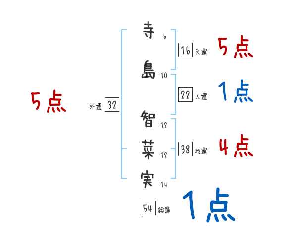 外運![]() | 寺島智菜実さんの外運は32画の5つ星!柔軟性があり成功する。チャンスが多く金運が良い。 生活面を象徴する運勢です。外部から受ける影響力を表し、結婚運、家庭運や職場、環境への順応性を表します。 |