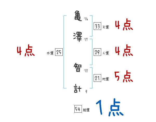天運![]() | 亀澤智計さんの天運は33画の4つ星!権力志向でプライドが高い。勇気があり運を切り開き成功する。 家系が持つ宿命的な運勢を表します。祖先から受け継いだ苗字ですので自分の力が及びません。家柄を象徴します。 |