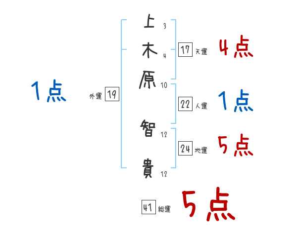 外運![]() | 上木原智貴さんの外運は19画の1つ星!優れた才能を持ちますが、協調性が足りないことも。周りの人と協力する事を意識しましょう。 生活面を象徴する運勢です。外部から受ける影響力を表し、結婚運、家庭運や職場、環境への順応性を表します。 |