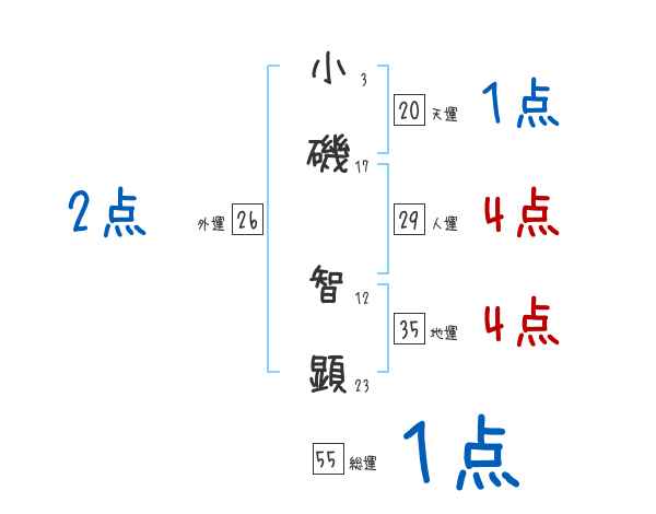 人運![]() | 小磯智顕さんの人運は29画の4つ星!完全主義で才能がある。厳格な心の持ち主。 性格や才能などを表す2番目に重要な運勢です。人間関係や協調性、社会的な成功に影響します。主に20歳から50歳ぐらいまでの中年期の運勢を表します。 |