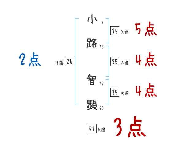 外運![]() | 小路智顕さんの外運は26画の2つ星!波瀾万丈かも。信頼できる人を大事にしましょう。 生活面を象徴する運勢です。外部から受ける影響力を表し、結婚運、家庭運や職場、環境への順応性を表します。 |