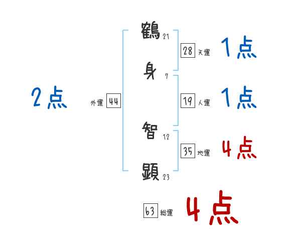 外運![]() | 鶴身智顕さんの外運は44画の2つ星!誠実で慎重な性格。物事を考えすぎないように注意しましょう。 生活面を象徴する運勢です。外部から受ける影響力を表し、結婚運、家庭運や職場、環境への順応性を表します。 |