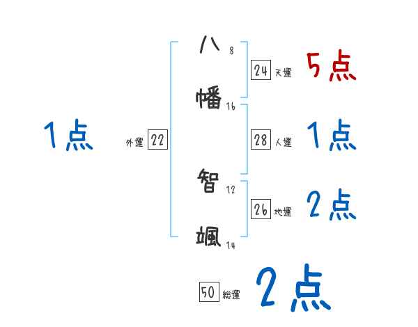 天運![]() | 八幡智颯さんの天運は24画の5つ星!家庭運が良く順調な人生。金運にも恵まれる。 家系が持つ宿命的な運勢を表します。祖先から受け継いだ苗字ですので自分の力が及びません。家柄を象徴します。 |