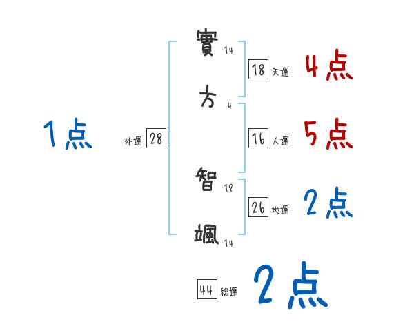 地運![]() | 實方智颯さんの地運は26画の2つ星!波瀾万丈かも。信頼できる人を大事にしましょう。 個性を表す基礎的な運勢です。性格形成や対人関係、行動力など家庭環境に影響されます。主に誕生してから20歳くらいまでの若年期の運勢を表します。 |