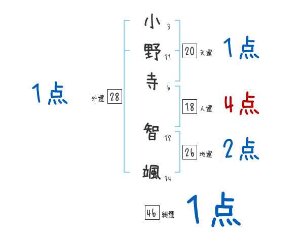 総運![]() | 小野寺智颯さんの総運は46画の1つ星!迷走することが多く苦労するかも。目先のことにとらわれないように。 あなたの人生を表す1番重要な運勢です。生涯を通じて影響する総合運となり、主に50歳以降の晩年期に影響を及ぼします。 |