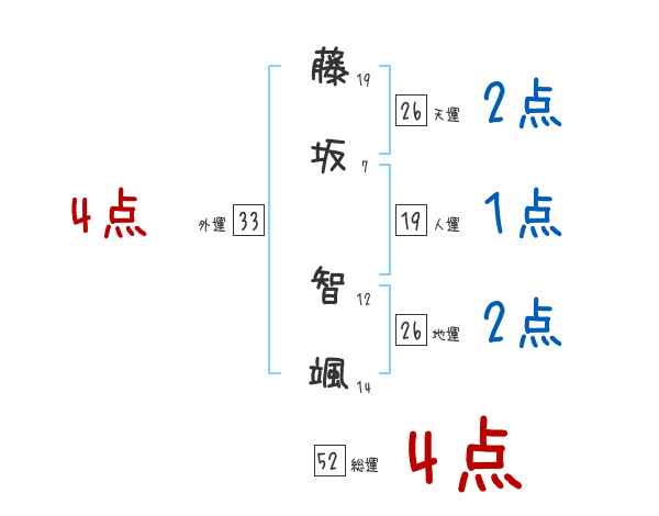外運![]() | 藤坂智颯さんの外運は33画の4つ星!権力志向でプライドが高い。勇気があり運を切り開き成功する。 生活面を象徴する運勢です。外部から受ける影響力を表し、結婚運、家庭運や職場、環境への順応性を表します。 |