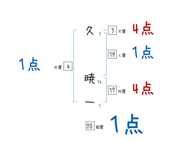 天運![]() | 久暁一さんの天運は3画の4つ星!活動的で才能に恵まれ、多くの信頼を得る。希望に満ち成長する。 家系が持つ宿命的な運勢を表します。祖先から受け継いだ苗字ですので自分の力が及びません。家柄を象徴します。 |
